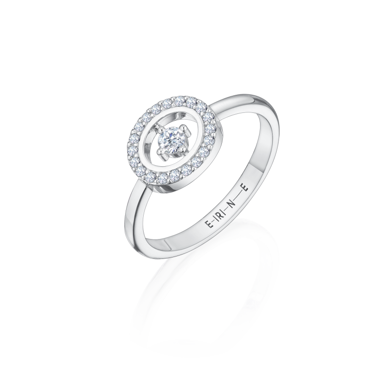 Classic white gold ring. In the center is a magnificent floating diamond framed by a shimmering scattering of diamonds. The ring will be perfectly complemented by stud earrings and a diamond necklace in the same style.