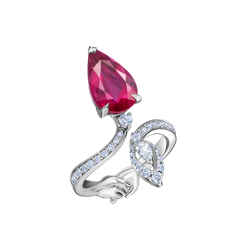 Pear-cut rubellite. Pear-cut and round-cut diamonds.